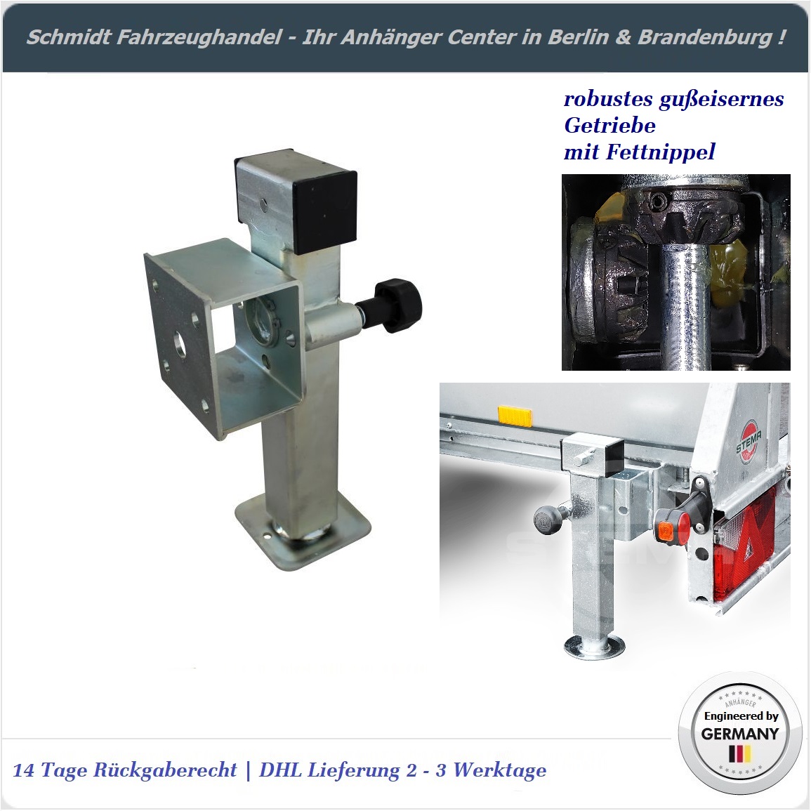 eignet sich für schwere Anhänger wie Minibaggertransporter, oder Hochlader - Anhänger, wo die Stützen im Unterbau mit Hilfe eines Flansches befestigt werden. Bei diesem Flansch kann die Stütze um 90 Grad gedreht werden.